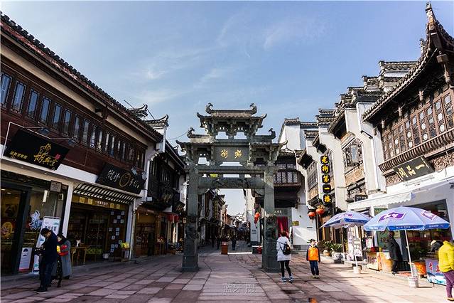 来到市中心,依据地图显示的位置走,我们很快就看到一块灰白色的牌坊,上面写着“老街”二字,我们知道这就是屯溪老街了。屯溪老街,是目前我国保存下来的最完好的一条徽州古街,被誉为“活动着的清明上河图”。