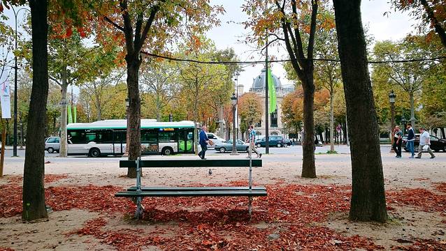 十月秋冬的香榭里舍大道有一种忧伤。枝桠上面的叶子都变黄了,而且有些变成光秃秃的。地上没有草,只有遍地泥沙,和落叶。