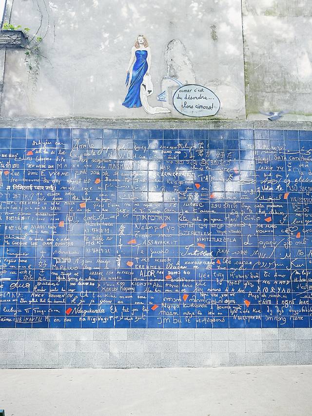 蒙马特高地的一个街头小公园里,在小公园里有一面蓝色的墙,创立者是一个音乐家,叫巴隆。他搜集了311种语言书写的“我爱你”,请一位法国女设计家设计了爱墙。