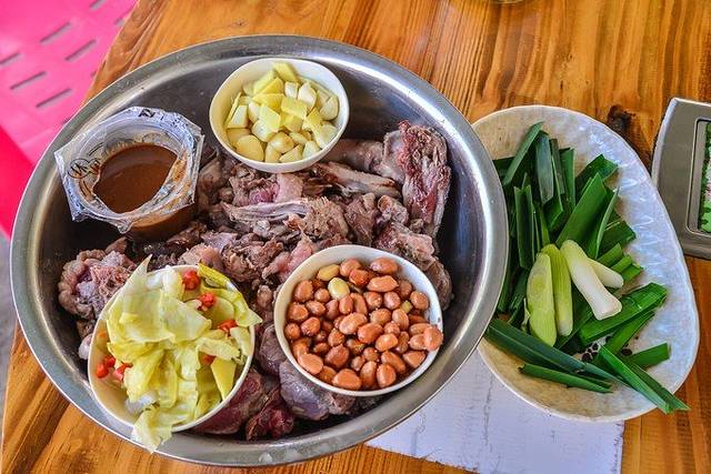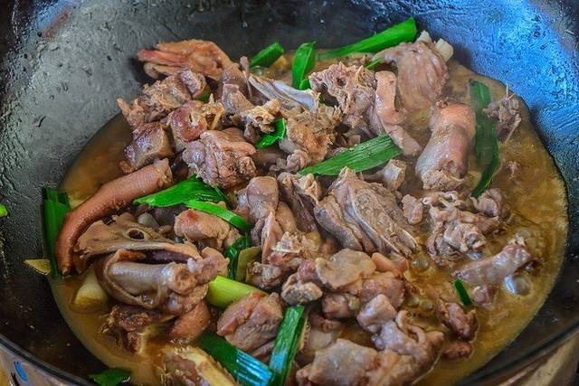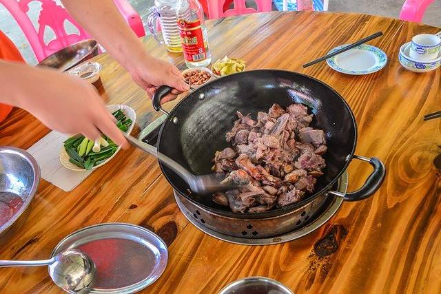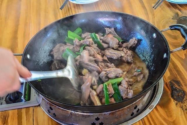 接近着端来一盆腌制过的鹅肉和炒料,在桌上直接炒制