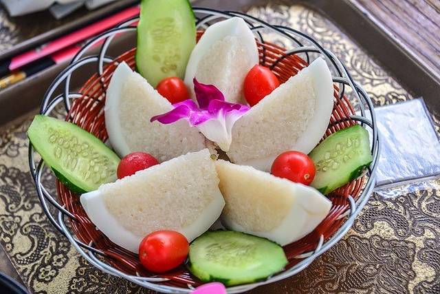在海南,以椰子做文章的甜品最受欢迎的就是椰子冻和椰子饭了,椰子冻是用椰子水配合牛奶椰浆制作而成,冰凉爽口,让人停不下来,而椰子饭,是用整个椰子肉瓤和糯米牛奶蒸制,熟后用刀切成几瓣方便食用。