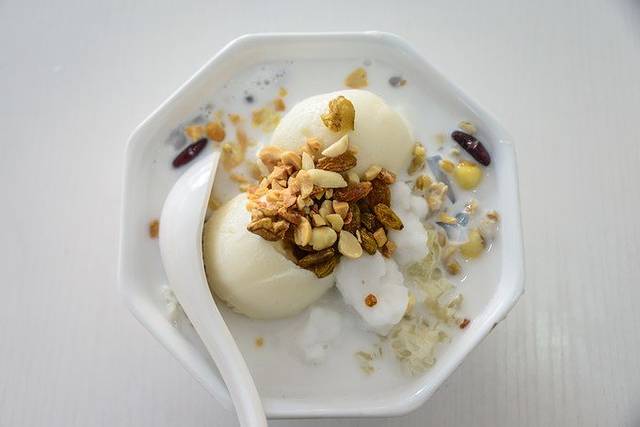 招牌的椰奶冰球清补凉,两个冰球是椰子味的冰淇淋,各种配料也很足,真的是诚意满满