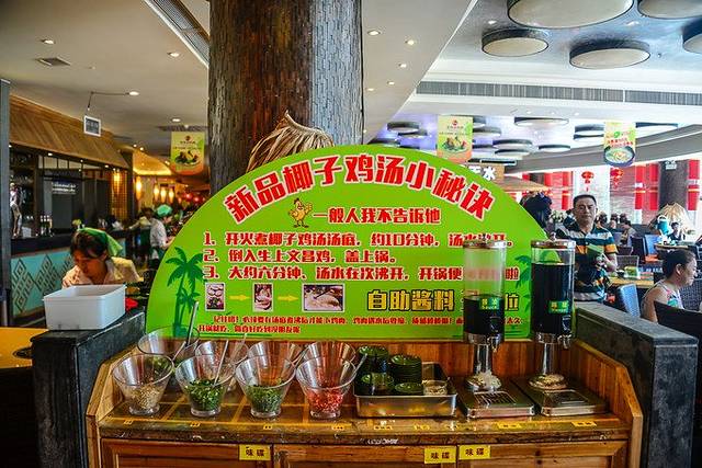 椰子鸡是清汤,口味清淡的可以品尝椰子和鸡肉的原味,喜欢蘸小料的,也有自助台可以自由搭配,上面有官方指导配方。