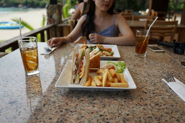 大堂到房间,房间到沙滩都是1分钟路程而已。到酒店房间稍作消息、换好衣服后就到酒店的餐厅享受迟延的午餐了。我们只点了一份饮料,然后上菜地时候服务员居然贴心地提供了两杯子冰块,然后将一杯饮料分成两杯。好感+++!这一顿580B,是不是很抵?酒店并不会因为位置出行不便就恶意抬价呢,赞赞!