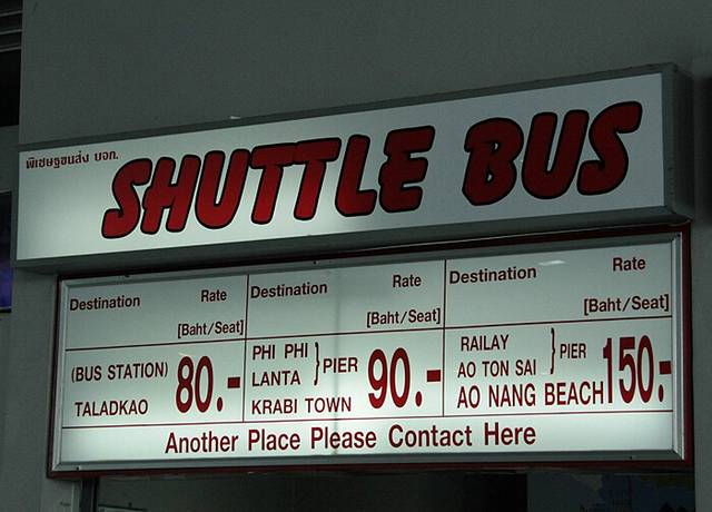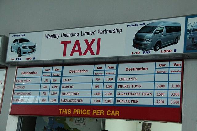 机场大巴到TALAKAO(公交车站)80B/人,到甲米镇区、兰塔岛码头、皮皮岛码头90/人,到奥南海滩、莱雷海滩、AO TON SAI码头150B/人。