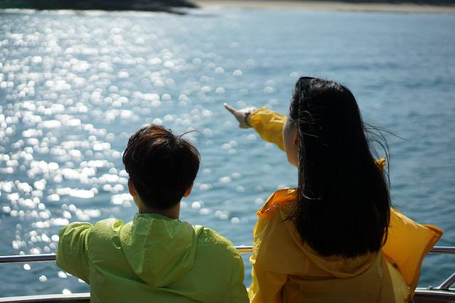 我们坐的是绿色快艇,里面可以遮阳,外面可以吹风看海。