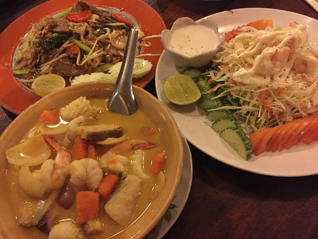午餐来到了正宗的日落餐厅,然而不是日落时间。这家店的出品很赞,价格比cook-kai稍贵,但其实也不贵(这一餐790B,约合人民币160元)。点的椰子海鲜饭料超多都吃不完,然后聪哥点了个洋葱牛肉,他至今都回味说好吃!推荐指数5颗星,建议傍晚来,可以顺便欣赏日落。