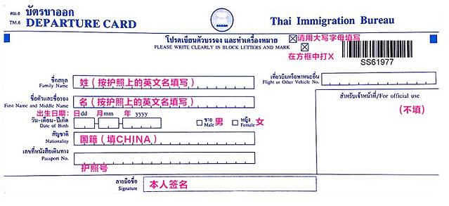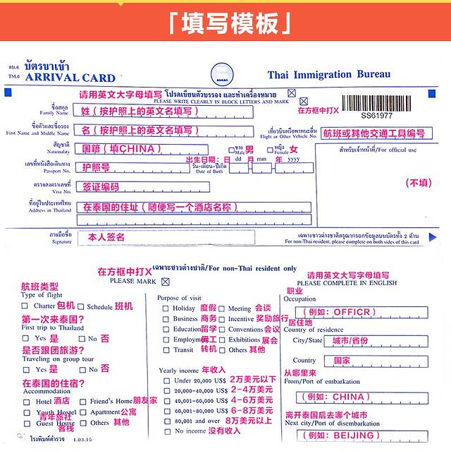 出入境卡每一个填写项目都有泰文跟英文,英文很简单,一般人都可以轻易解读。但是入境卡的填写会涉及到你将到达的城市名称及入住酒店的名称,因为飞机上不能使用手机,所以建议将机票预订单及酒店预订单打印出来以便检索相关信息填写出入境卡,也可以打印出入境卡的填写模板出来,提前写好相关信息后在飞机上抄写。当然,如果你不会填的,可以问问空姐跟其他乘客,一般都可以顺利解决的。