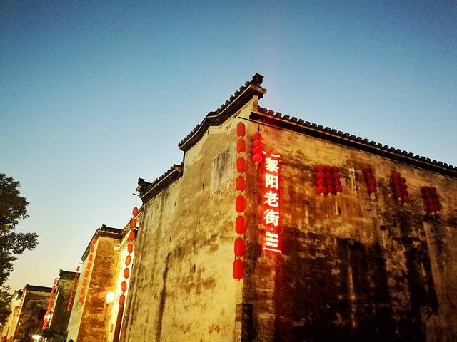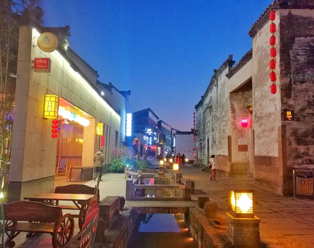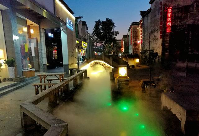 还是先去黎阳老街吧,因为先看到它的牌子。黎阳老街是一种现代化气息和传统气息完美结合的特色老街。老街内一条小河贯穿其中,河边设有喷雾装置,时不时喷喷雾,骚气的不行。以小河为界,一边是现代化商业街,一边是古老的徽派古建筑,相互映衬。走到一处戏台,台前摆满了老式长凳和八仙桌,戏台对面的墙上,投影着不知名的的黑白戏曲,忽现忽现的。