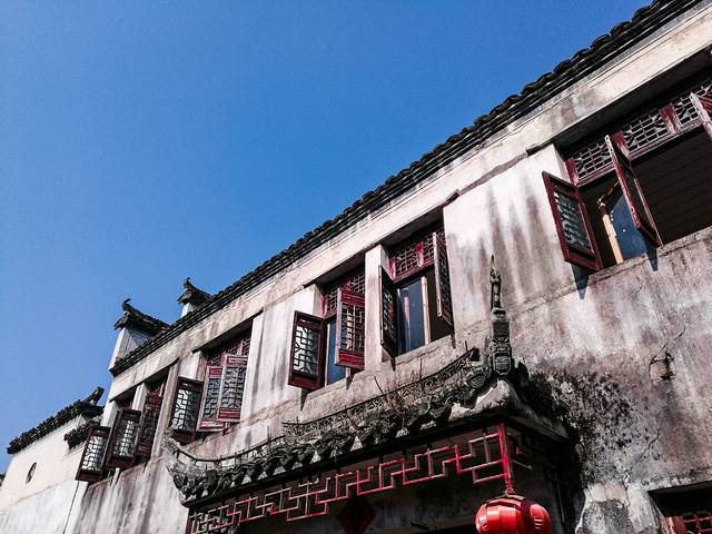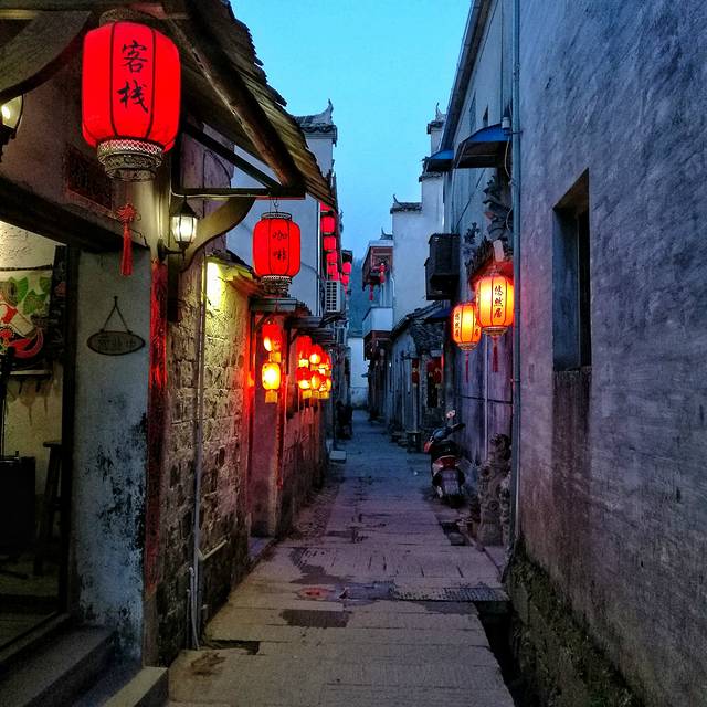 太阳终究还是下去了。南湖对岸的墙上稀疏地挂了几个灯笼,此时也亮了,虽然天还是亮着的。从南湖的桥上走过到对岸正好又是一条巷子,往里走,各家各户客栈门前的红灯笼都亮了,游客们都开始用餐了,暖黄的灯光从古式的雕窗中透过来,带着客人的欢笑声。。。这倒有点节日的气氛了,所以我不急着吃饭。