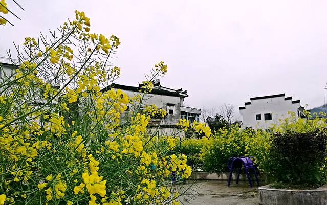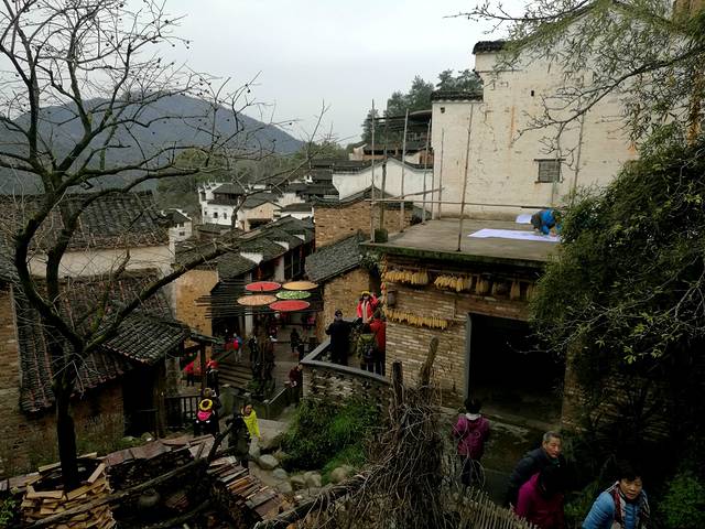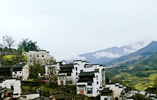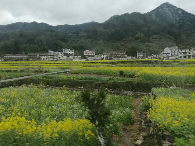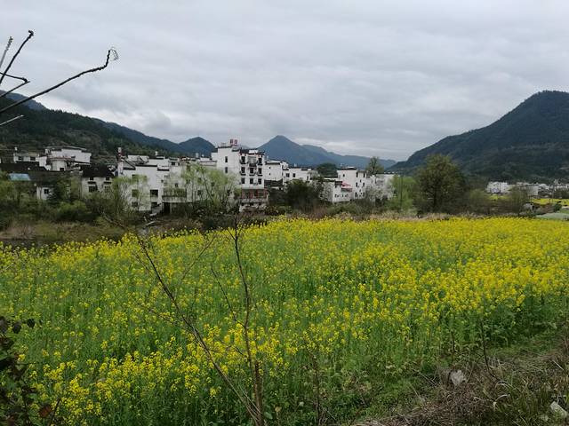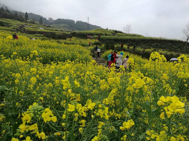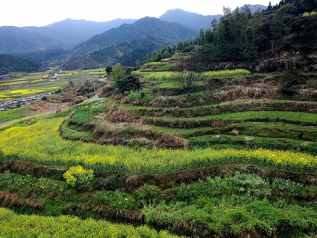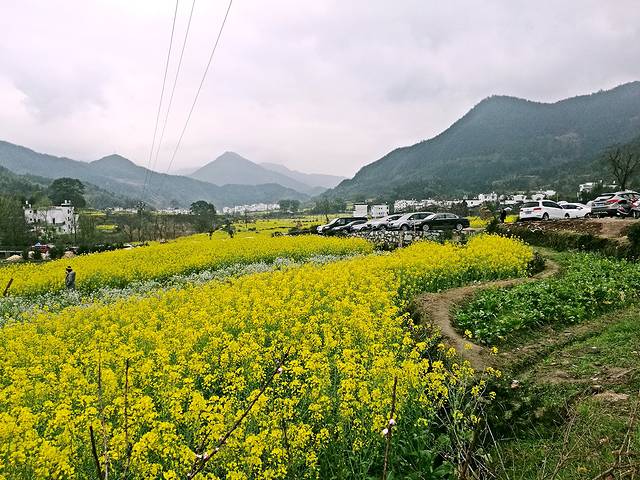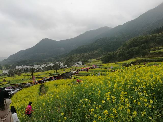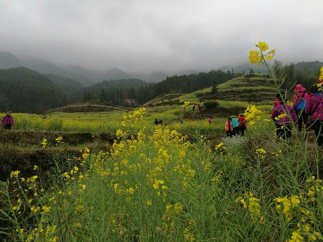 接着去欣赏油菜花极佳观赏点“江岭梯田风光”江岭是婺源的王牌景点,也是婺源田园风光的代表,婺源最有名的油菜花赏花地就是这儿。今天天气很作美,导游说已经连续下了10几天的春雨,今天终于停了,看来人行善福伴是有道理的。刚一下车当地老乡就围着我们推销花环,大家不分老小女士每人头都带着花环,我到了景区立刻被这里漫山遍野的油菜花呈梯田状吸引着,站在油菜花田中远远望去油菜花层层叠叠,一望无际,中间围拢着几个小小的村落,黑瓦白墙的徽派民居夹杂在一片金黄之间,雨雾罩着婺源再没有比这更壮观而令人惊喜的了。人们在花海中摆着各种姿势拍照着,头上花环上露出黑色头顶就像黄色花海中的小蜜蜂移动着。我用自拍杆可以用不同的角度给自己拍着,真是自得其乐。等我们美景拍照完了,天又在下起小雨。今天住在屯溪的酒店里。