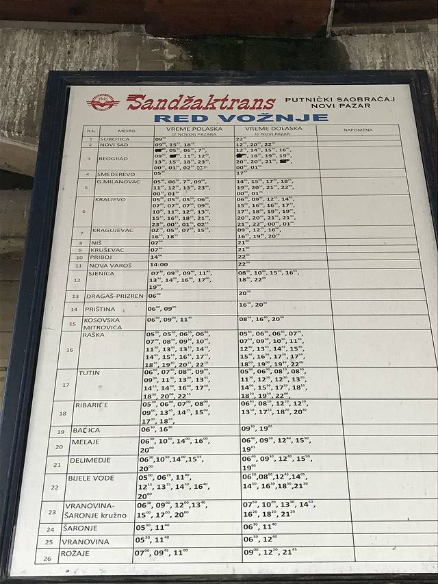 Tips:新帕扎尔的汽车站不像贝市诺市尼什这些大城市那样要先买票,而是直接上车再买。每辆车都会有一个售票员,中途上车后他会逐一过来收钱,到时候再告诉他你要去的地方就可以了。我从新帕扎而到Usce一共300D,回来则要了我350D,两程都是坐上了贝市到新帕扎尔的班车。另外我这次其实由于不熟悉走了些冤枉路,其实完全可以从新帕扎尔出发,去完修道院之后在Usce直接坐车到克拉列沃甚至是克拉古耶瓦茨,次日再从那里去尼什,这样一来不仅去多了一个地方,不用走回头路,而且从克拉列沃到尼什估计会更快一些。