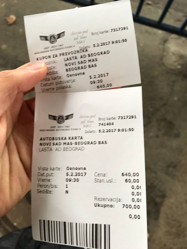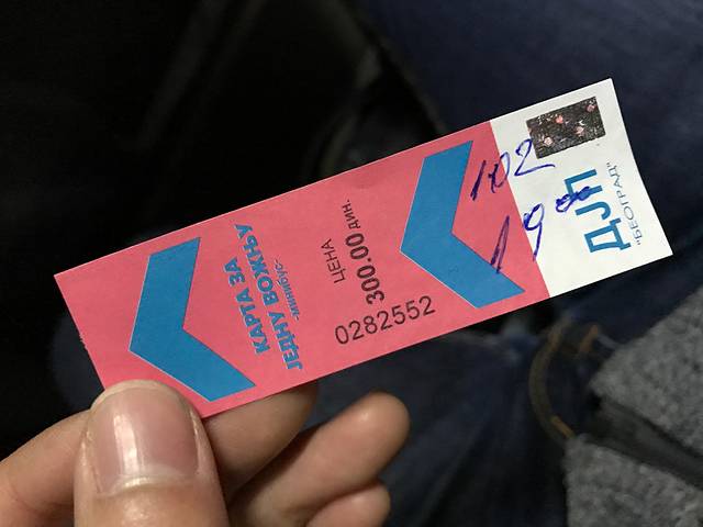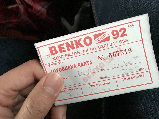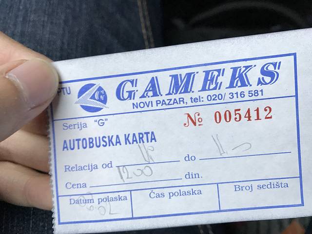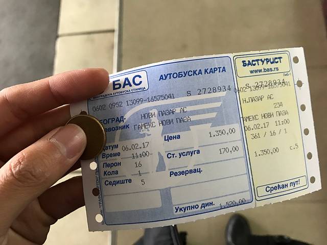 Tips:贝市到新帕扎尔一共1350D,左边那个小硬币就是进入车站用的。塞国南部多山,全国基本只有一条贯穿南北的高速公路A1,东南起尼什,连接贝市、诺市,北接苏博蒂察。所以我们的大巴在Kragujevac附近就转入山路,沿24、22国道一路向南。因为国道,沿途的所有城镇几乎都停靠一下,因此上午从贝市出发,坐了5个小时才到达新帕扎尔。