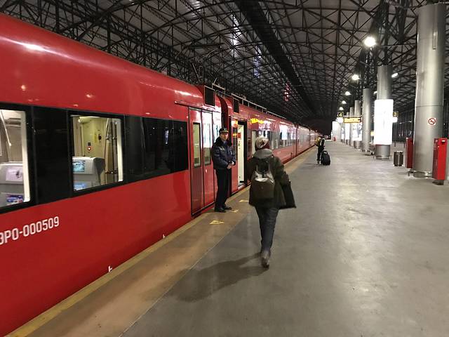 Tips:莫斯科几大机场都有自己的机场快轨(areoexpress),LOGO是五架飞机组成一个大大的红色五角星,专门对接五号环状线上的一个站。SVO机场快轨对接的是白俄罗斯站,30分钟就可以从机场到达市区,非常快捷方便。单程500卢布,据说网上买会有优惠。买票后刷条形码入闸,但是从白俄罗斯返程就不用,是先坐车,到了机场出闸的时候再刷票。全程没有固定座位。