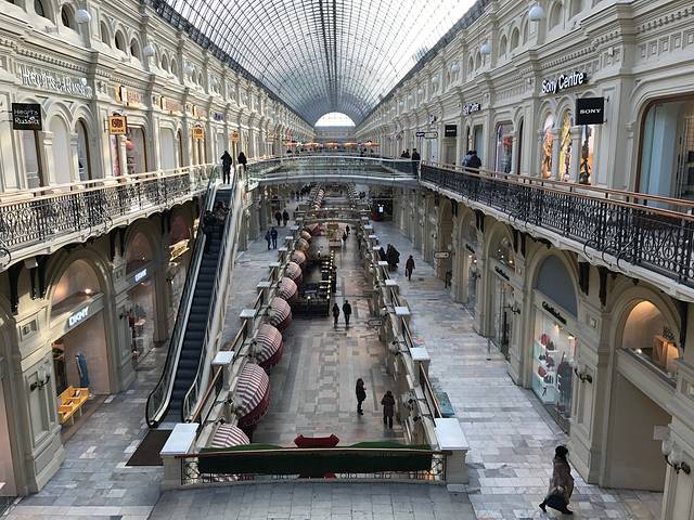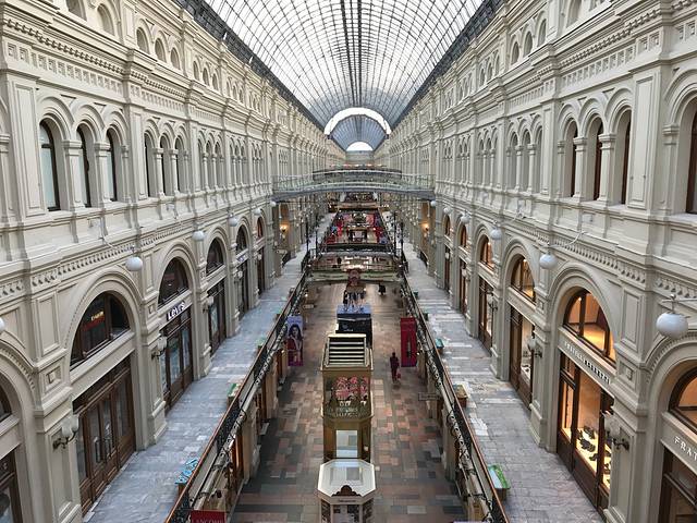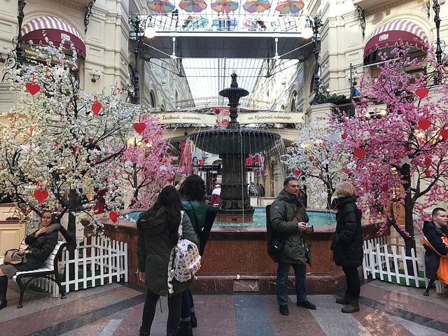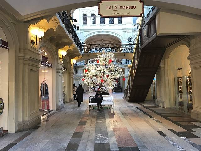 商场就位于喀山大教堂隔壁,我进去完全是处于取暖。里面一共三层三条走廊,中间有一个喷水池,是可以买买买的地方。