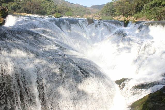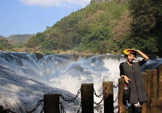 景区出来坐车去第二个景区银链坠,这个是我最喜欢的,太美了,逗留很久,景区很大3个小时,里面还有猪八戒背媳妇的高老庄,水上石林,喀斯特地貌区,银链坠瀑布,很漂亮无法用语言说明,四个女人一路拍照,哇啦哇啦兴奋的直叫。银链坠最美了,我们幸运的看见了彩虹,太美了。