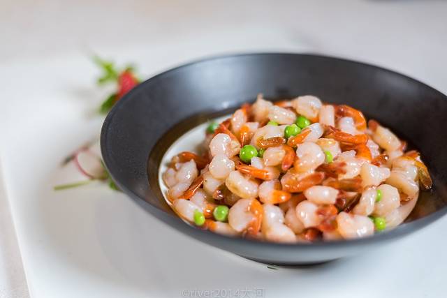 太湖凤尾虾仁,虾仁是一个一个手剥的,虾壳却不剥净,偏偏留下尾部小小的一片,当然不仅仅是为了好看,这样吃起来虾肉更加紧致美味。若是没有青豆点缀,这道菜在色彩上就会损失大半。