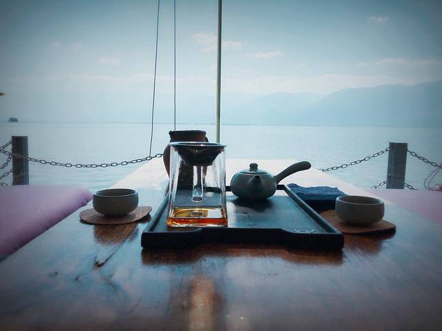 因为我懒又或者说我更喜欢这种坐着静静喝茶享受的感觉,所以把原先安排的玉几岛、南诏风情岛等行程都推了(而且岛上现在也是在排管道的,所以更不愿意去了);故而下午我们便分道扬镳了,曼丽夫妇打算出去走走,而我和山水打算下午换地继续喝茶,临走前约了晚上大堂再聚