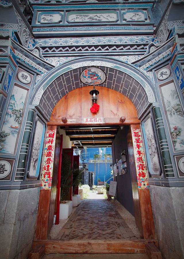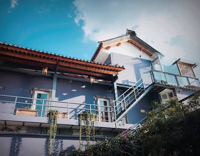 一路走走停停,待我到达客栈时总计耗时一个半小时。客栈名为半月拖蓝水景雅院,取自明代文人杨升庵的诗句“山则苍笼叠翠,海则半月拖蓝”