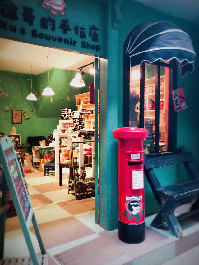 徐哥の手信店以大面积的绿色面块为主,给人较强的视觉冲击感,也是一处上镜的绝佳之地。小店出售一些特色工艺品和明信片,可快递,老板人幽默而热情