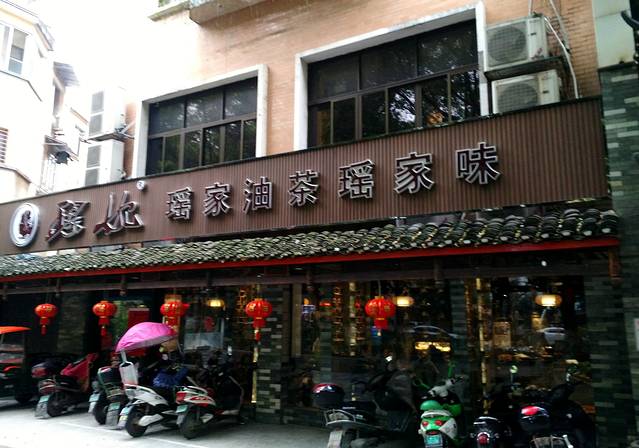 在桂林七星路的三里店广场附近,有一家招牌为“遥妃故事”的餐馆,经营以“瑶家油茶”为主要餐食的瑶族特色美食。此餐馆的文化氛围更胜于餐食的美味。