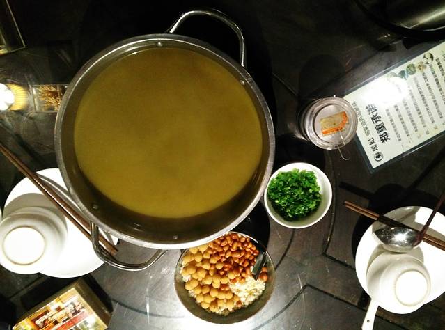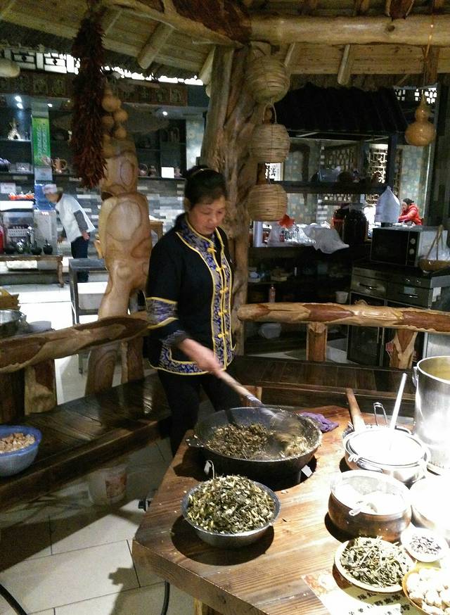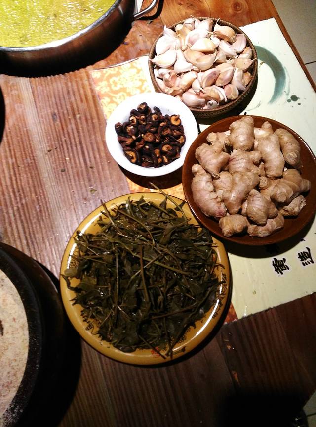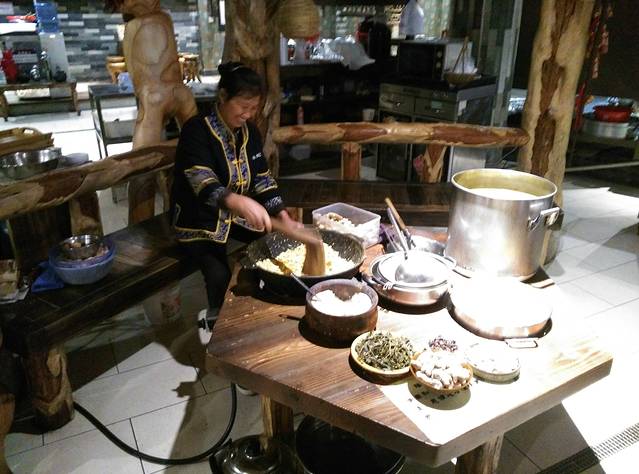 瑶家油茶与北方油茶不同,更像茶水,喝起来开始感觉微苦,后尝出微辣,闻起来有特殊的香味。店堂里有位大妈在制造油茶,我们又看又问,才知道油茶主要是长杆茶叶、香菇、生姜、大蒜、花生等捣碎,加油(茶籽油或花生油)炒制,最后加水熬成。油茶喝了后感觉肠胃很舒服,暖暖的,特别在阴冷天气喝很适宜。据说瑶家用油茶代替奶粉、米糊喂养婴儿。