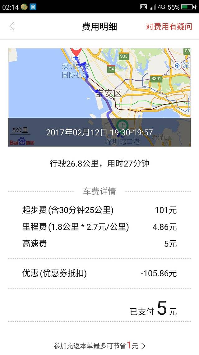 9. 提前预约了易道用车,在蛇口码头1元送机服务到深圳机场,用时30分钟。1元卷加5元的高速费用