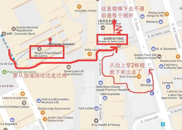 与升降机顶层相连的卡尔莫修道院(Convento do Carmo)是葡萄牙里斯本的一座历史建筑,典型的哥特式修道院在1755年里斯本大地震中成为废墟。误打误撞的我们居然找到了从这里免费不用排队上圣胡斯塔的路。