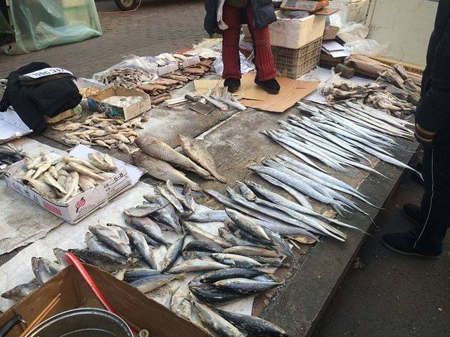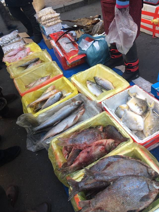 首先一大发现是,哈尔滨卖水产的真不少。短短的一条街起码5家卖鱼的摊位。最有意思的是他们卖的鱼都是冻得硬邦邦扔地上卖的..对,酱式儿的: