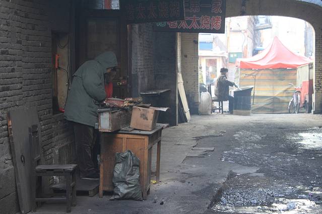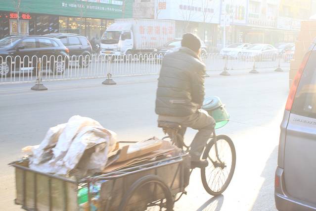 这是在等公交的时候拍到的。蹬个小三轮,车把上捆一桶,拿根儿小棍咚咚咚的敲,也不吆喝,可能哈尔滨那里收破烂的都是这样的吧。就像“磨剪子戗菜刀”一样吧。