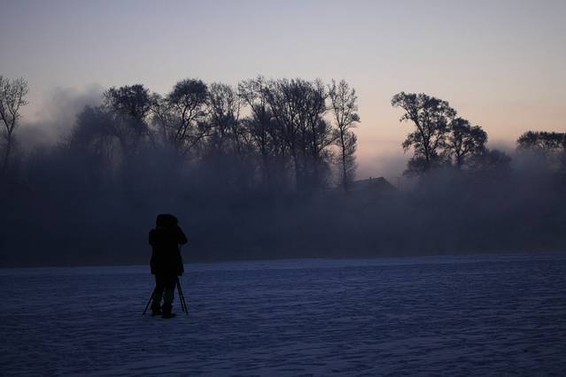 松花江在这段是不结冰的,这是因为上游有丰满水电站在不断放水。也正是因为丰满水电站放水、江水不结冰,才会有水气蒸腾,才会在夜晚形成雾凇。