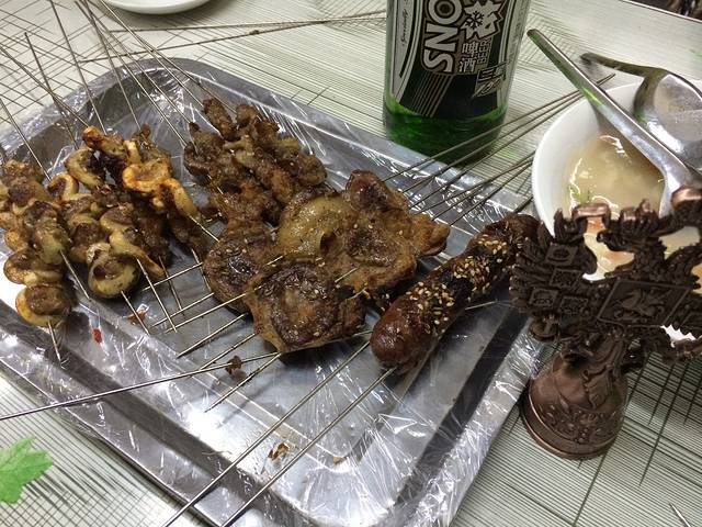 出了青旅找一家街边小店撸把肉串。比较有当地特色的是心管夹肉,要来一把;大腰子片得很薄,很好吃;还有听说东北这边儿撸串配疙瘩汤,那么就来着;以及啤酒!比较遗憾烤实蛋没有吃上,因为店家忘了给烤了。
