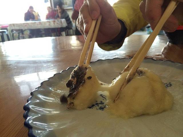 然后回去吃中午饭。摄影基地是包三餐的。当然免费的午餐不会太好,不要强求,大家酌情再点一些吧。我们加了一个菜还有5个粘豆包,粘豆包好粘~