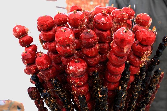 其实应该是得益于当时寒冷的天气,造就了独特的味道。因为冷,所以冻得非常瓷实!你想把糖葫芦咬碎了?做梦!正确的吃法、也是唯一的吃法是,咬下一整个山楂,含在嘴里等着化。等着糖慢慢化开,甜味儿就出来了,山楂化开了,酸味儿就出来了。冰凉酸甜味儿混在一起,这才是冰糖葫芦应有的味道。