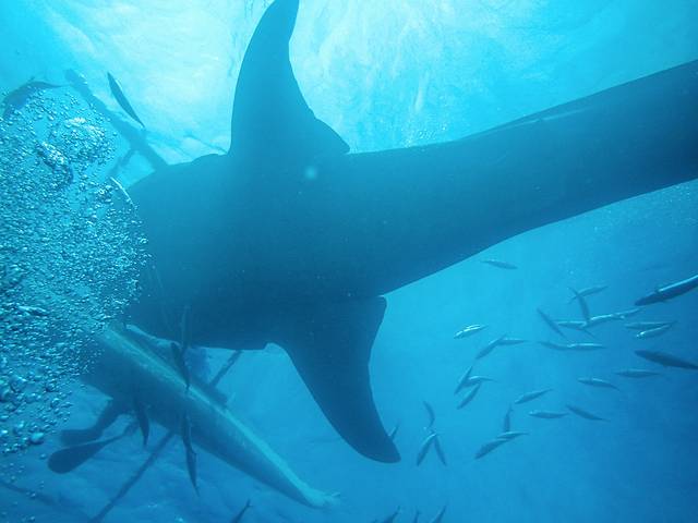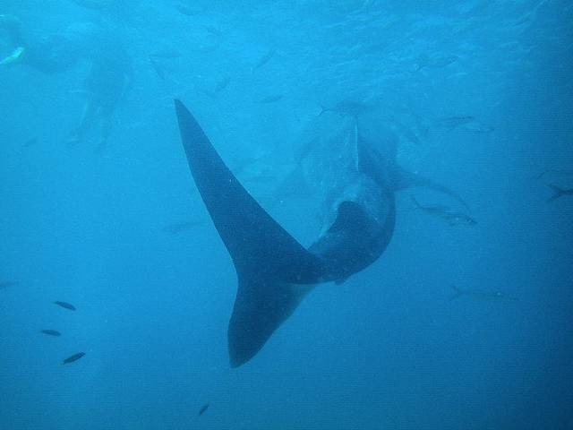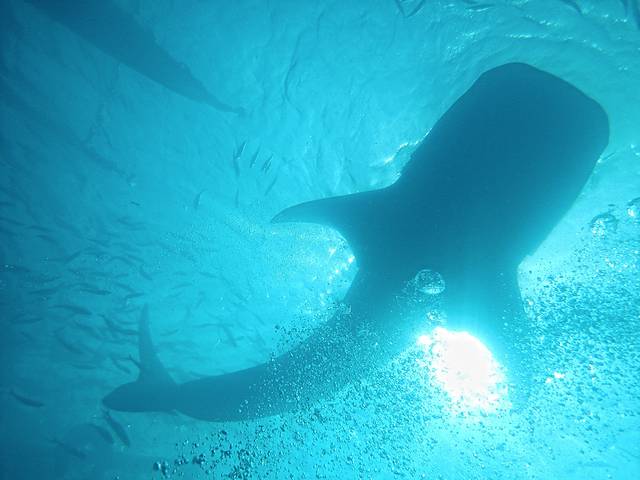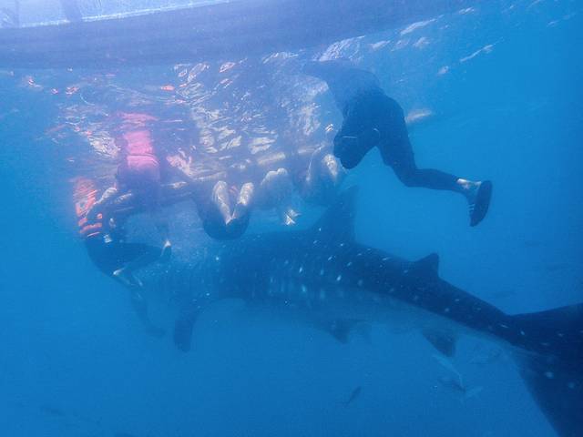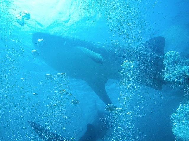 我们的船在区域外停下来,小黑说这儿不许开闪光、不能用人工光源,而且不能浮到水面上,否则会被罚款。穿好装备,下水后顺流潜到喂养区域,就可以看到很多鲸鲨在头顶穿梭。实话说,潜水第一次看到这么大的东西,的确震撼。不过不知道是季节还是什么原因,看到的大多是4-5米左右的小鲸鲨,10多米以上的成年鲸鲨几乎没有看到。