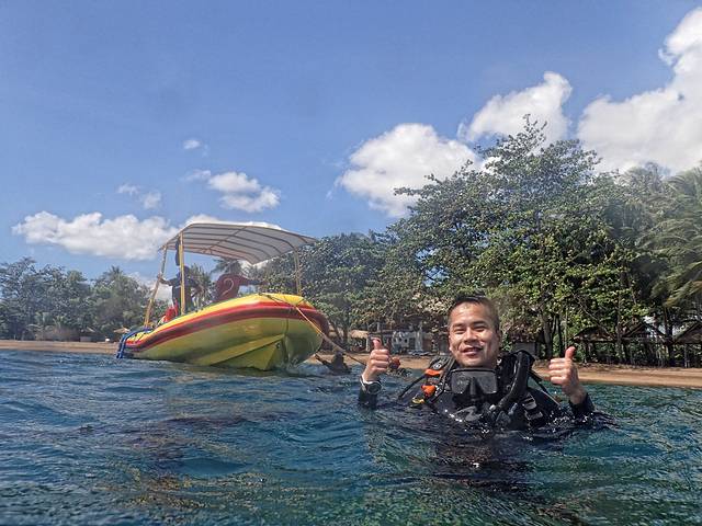 经过3个多小时的车程,我们的车在镇上的一间潜店前停下,我们下车后,终于再次听到海浪的声音,闻到曾经熟悉的海腥味,那种感觉将旅途的舟车劳顿一扫而光,兴奋地打量着即将入住的潜店。老板阿K一直等着我们,听到车声,也迎出门来,他乡遇故知的感觉,真棒!