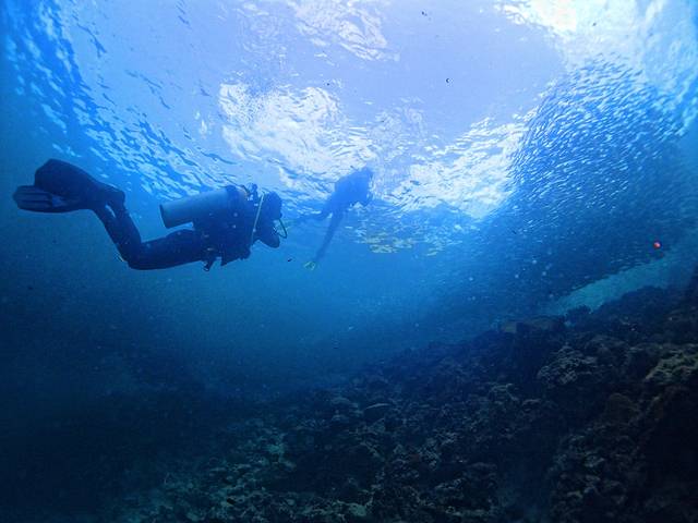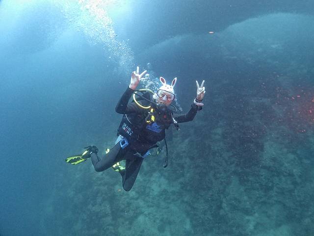 其实在墨宝岸潜很辛苦的,想想弱不禁风的女子背着好几十公斤重的装备下水,再游出去,的确很累。特别是顺着潜一段后,升水,再背着装备走回潜店……想想都心累啊……幸好教练比较幽默风趣,两位小O们也乐在其中。