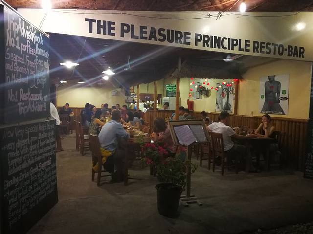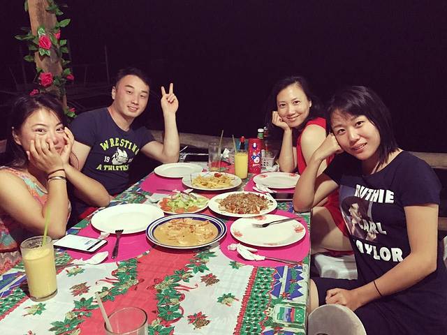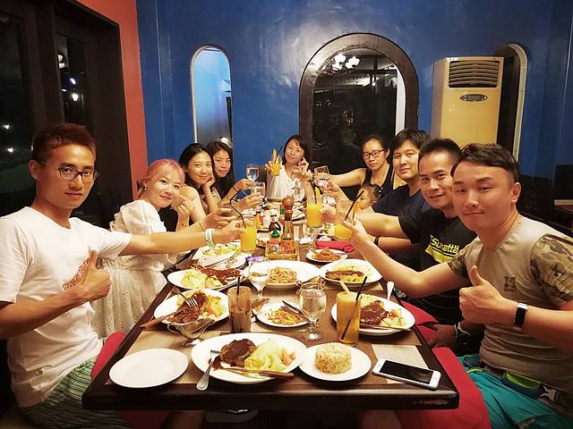 觅食,是每天必不可少的一项任务,两潜过后已是下午2点,早就饥肠辘辘,喊上两位学OW的美女,一起去镇上吃饭,但因为她们下午还有紧张的课程,只能随便吃点祭奠五脏庙。待到傍晚全部完成第一天课程后,我们四人在镇上逛了逛,寻找美味。最终,发现一家极具人气的餐厅,绝大部分是欧美面孔,直觉告诉我们,这儿肯定不差,连忙找位置坐下,面对着全英文的菜单开始搜寻。大快朵颐一番之后,大家满足的表情证明:我们的选择没错!(拍了张门头照片,供大家寻找)