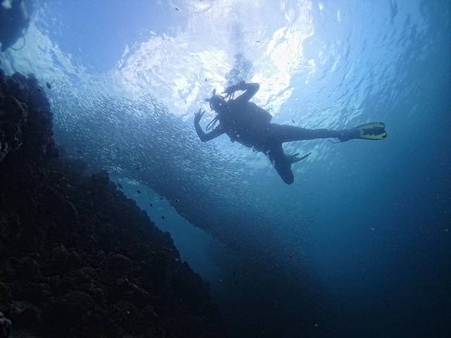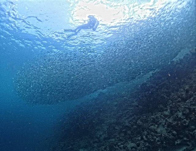 这天早起,太阳很灿烂,心想,今儿沙丁鱼风暴应该看得更好些了吧?于是乎,带着两个即将毕业的小O们,匆忙忙下水。真的,比昨天要好的多。拍了一些照片。大家看图吧!那种震撼,真是无与伦比的。