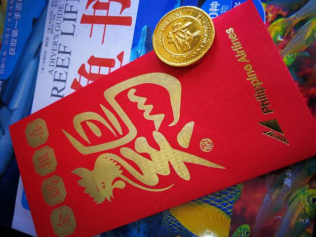 也许是大年初一的缘故,一上飞机,菲航的空乘们就给每位乘客发了一份红包,从外观看,做得很用心。惊喜的我们以为真有硬币,打开一看,是个金钱状的巧克力。总而言之,还是很暖心的。