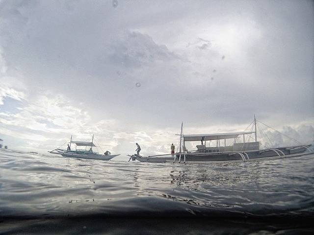 果不其然,下去啥也拍不了。本来风暴就遮天盖地的,加上阴雨天气,根本出不了片子,看看我在水面拍的照片,就知道天气又不好了。所以,只能在水下自己感受那份震撼。无奈,上水玩飞机,拍拍小O们学习的场景。