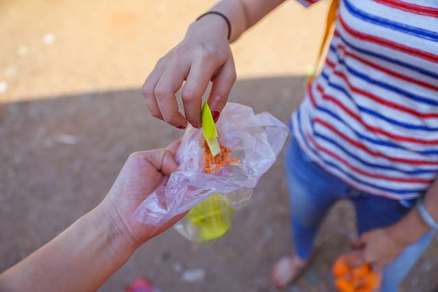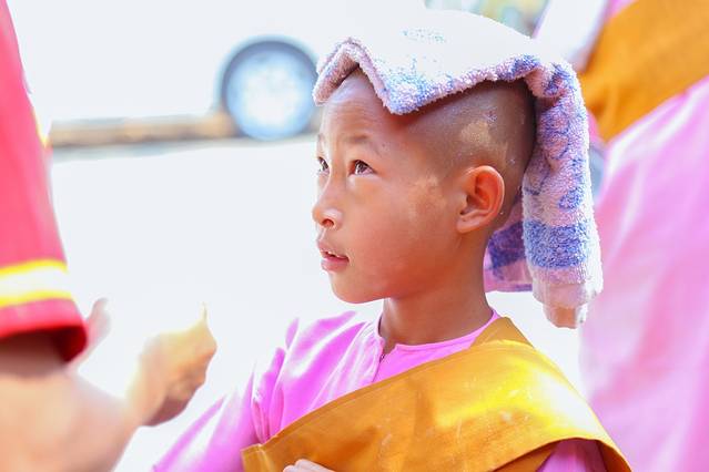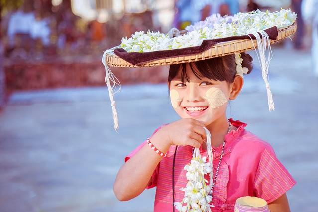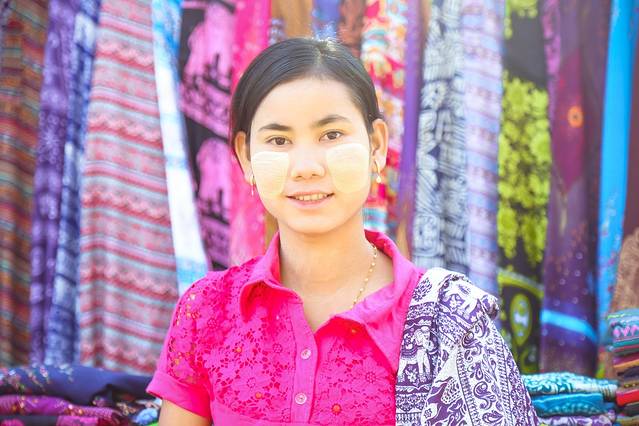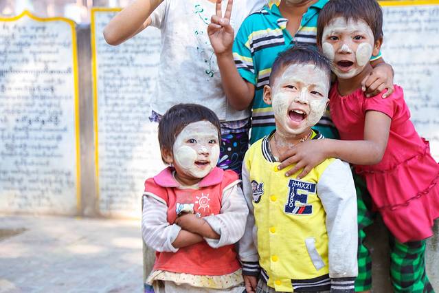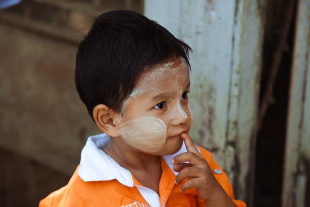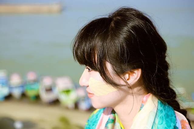 许多成年人和小朋友脸上都擦着“特纳卡”,这是他们的护肤品兼防晒霜,有的只用手抹抹,有的还用叶子和小树枝画了各种图案。特纳卡其实是用黄香楝树磨成的粉,缅甸人家家户户都有磨特纳卡的小石磨,黄香楝的小树枝切成一段段,加点水磨一下就可以涂在身上和脸上了,涂上以后很快就能干,最后会变色成黄黄的一片,亲测大概半天脱落。