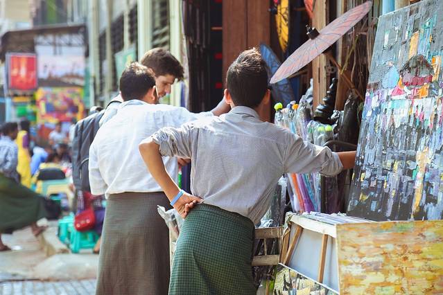 昂山市场(Bogyoke Aung San Market)的开放时间是9:00-17:00 ,每逢周一休市。到了昂山市场,我们先去买隆基(女生叫特敏),穿特敏有点小麻烦,要用绳子绑紧,如果没绑紧就尴尬了。阿树买的价钱是一条20000 kyats。