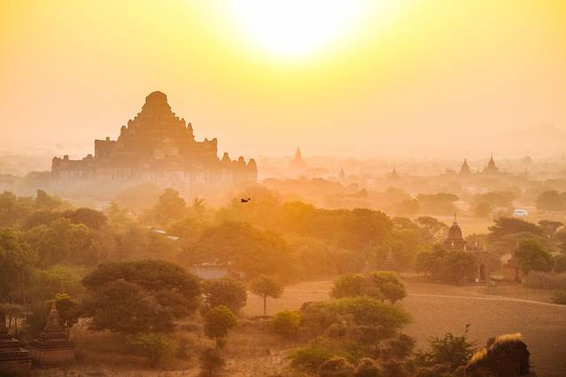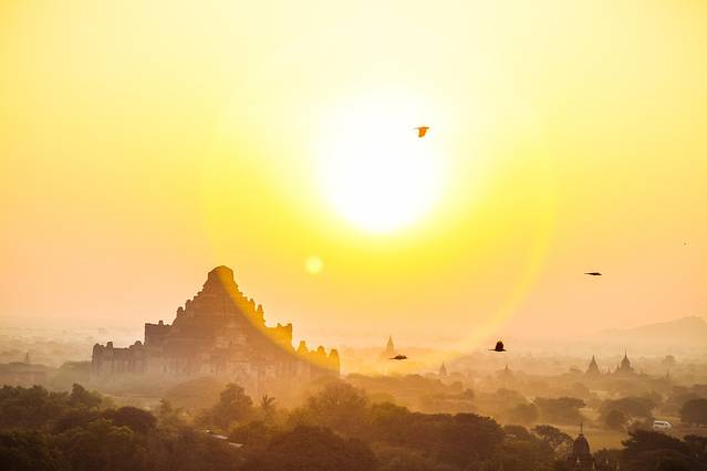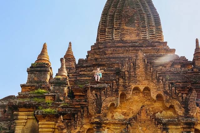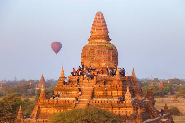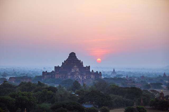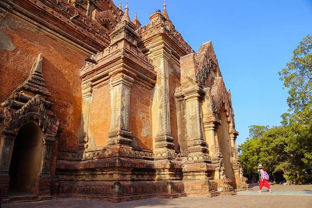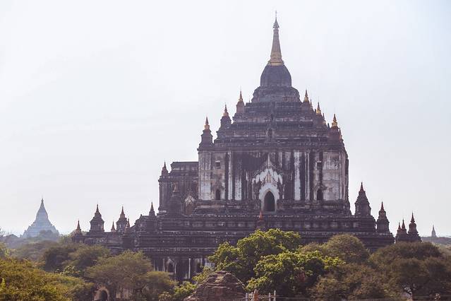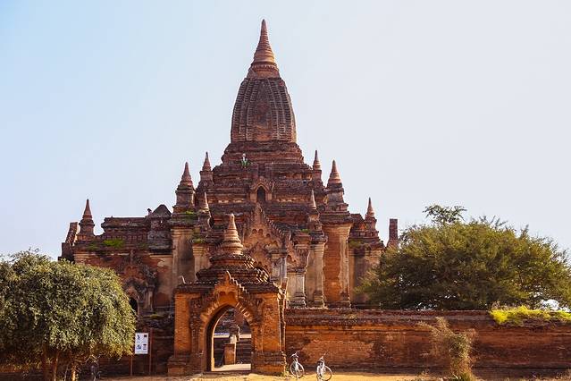 6.达宾纽塔(Thatbyinnyu Phaya)蒲甘最高的佛寺,高67米,Thatbyinny的意思是佛陀无所不知,有“神庙”的美誉。由阿隆悉都Alaungsithu王建于1144年,是蒲甘中期成熟技术的代表作,与阿南达塔并称“蒲甘双塔”。以前是观看日出日落最好的地方,后来为了保护此佛塔,已经封闭通往顶部的阶梯,观看日出日落最好的地方被许三多佛塔Shwesandaw Phaya取代。