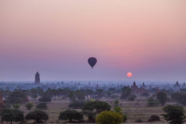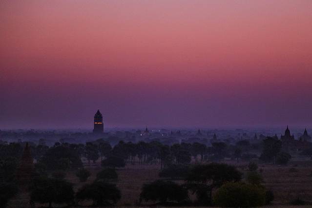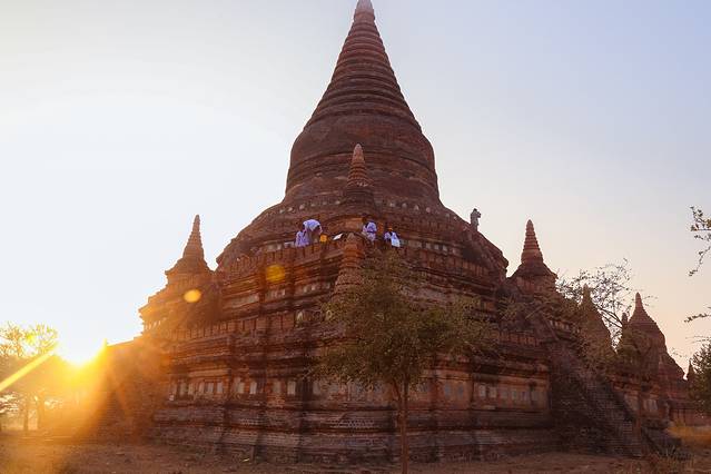 另一个日出日落有几个选项,一个是著名的穷游塔,名字叫Shwe Nan Yin Taw Monastic,二是有人推荐的Dammayangyi Pagoda达玛央吉塔,三是同样有人推荐的Pyathatgyi Temple。而我是在Bulethi看的日落,在它前面的405塔看的日出,人都不多。Bulethi这个位置比许三多离热气球升起来的地方近一些,更适合拍热气球一些,缺点就是前面没有特别好看的佛塔做衬托,日落景色也比较一般。听说缅甸现在禁止爬佛塔了,不知道这些塔是否在禁令范围,欢迎最近去的人介绍一下。