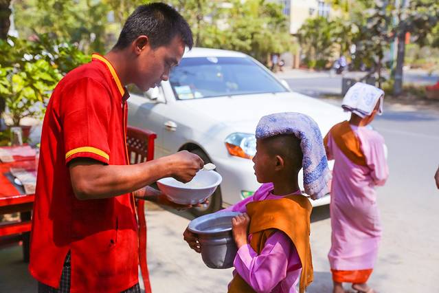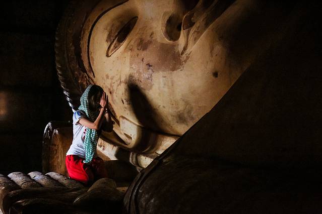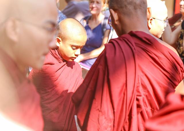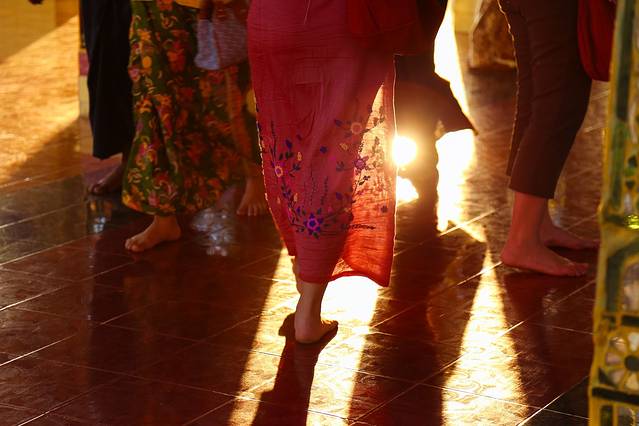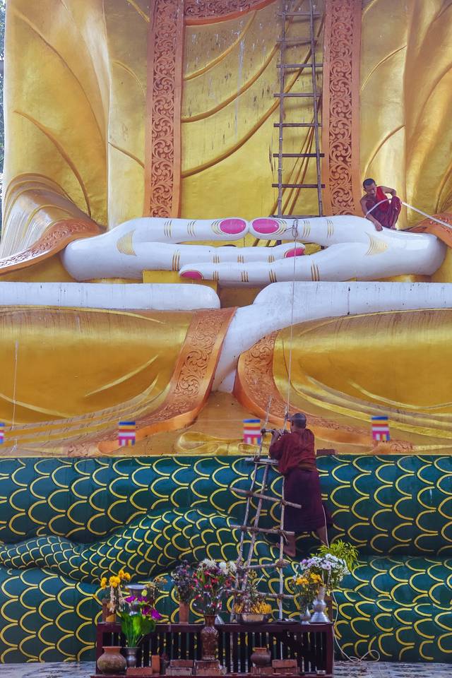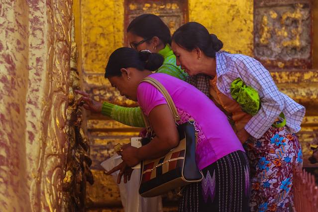 中国的大观名寺总是游客比香客多,缅甸的各个寺院,却是当地人远远多于游人。曼德勒马哈穆尼僧院里的大佛,自重建以来,由于民众年复一年地贴金箔,已经由青铜佛像变成了真正的金佛。亲手贴金箔的时候才知道,薄薄巴掌大的金箔,一沾手就碎了,一不小心至少就有半张变成金粉粘在手上,真的能贴上的只有一点点,还要无比耐心,缅甸人像患了贴金箔的“强迫症”,在蒲甘的佛寺,常看到信徒为阶梯边上的或是角落的佛像耐心地贴金箔,让人不由得对信仰的力量肃然起敬。