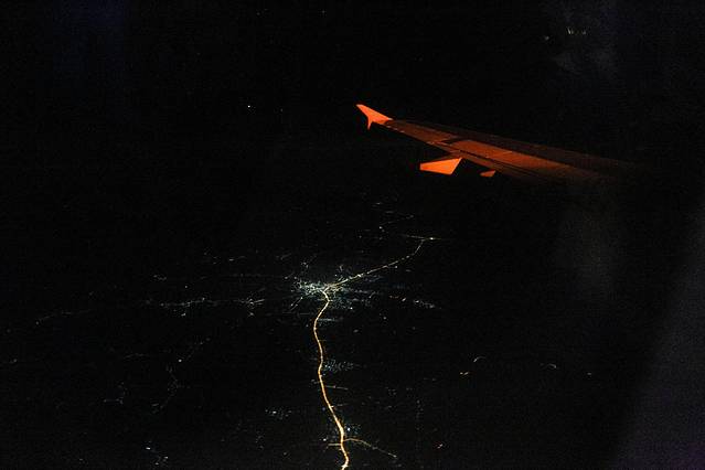 22:20从香港起飞,感觉可以很清晰地分辨出越南的城市,在天上看真是美丽惊人。越往西边灯光越暗淡,到缅甸上空差不多是一片漆黑。途中飞越过天空中的一扇门--飞马座、耀眼的冬季银河,还人品爆发地看到流星。