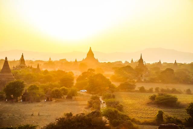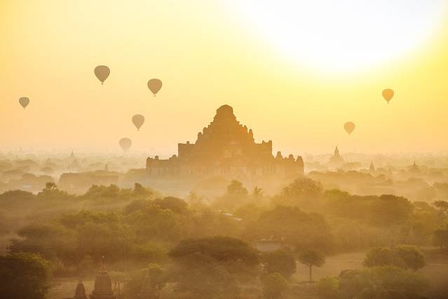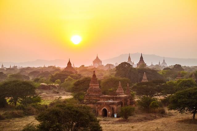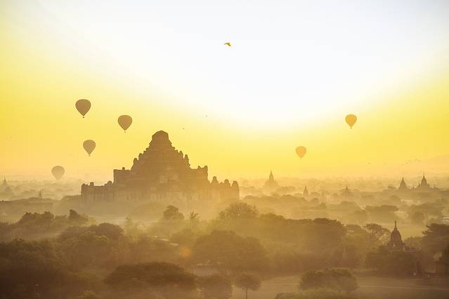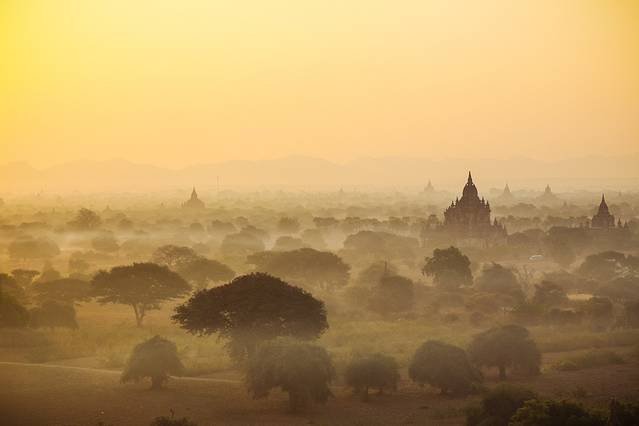 蒲甘位于伊洛瓦底江畔,是缅甸第一个王朝“蒲甘王朝”的首都,建于西元849年,1044年阿奴律陀(Anawrahta)王,将蒲甘王朝推到前所未有辉煌时期,并将国教改为小乘佛教,阿奴律陀的儿子奇安纪萨(Kyanzittha)使蒲甘成为传说中的“四百万佛塔之城”,国力达到顶峰。在蒲甘王朝最强盛的二百年间,这片平原曾有多达12000座寺庙。经过大火灾和1972年的大地震后,1978年仅存2230座。