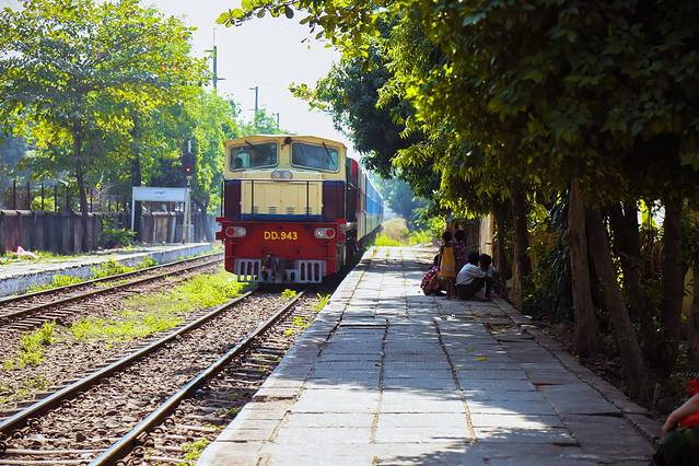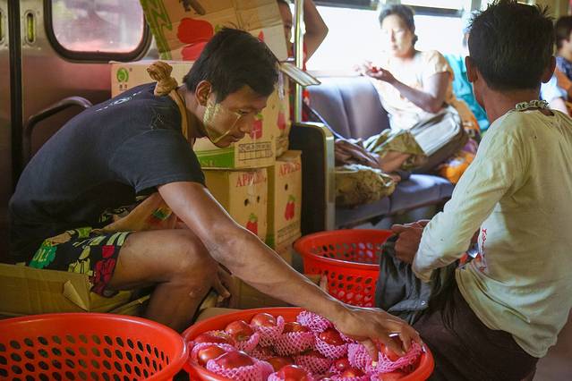 小火车使用的是上世纪二战后日本人留下的旧车厢,买票上车,票价200k每人每次,随意坐到哪个站都行。每个车厢都像一个市场,可以走来走去。我们上车的那个车厢里有两个人在分拣果子,有人看报,还有头顶着大盘子的妹子在卖菠萝。喜欢拍人文的建议多留点时间给它。上车之前要用Google map或者地图数好到目的地有几个站,小火车没有报站,到站了自己要下车。