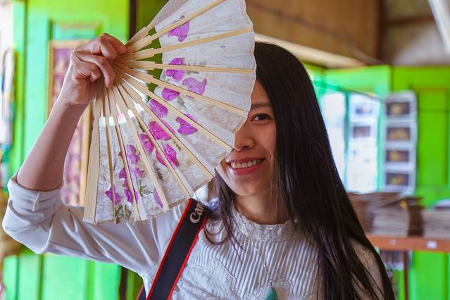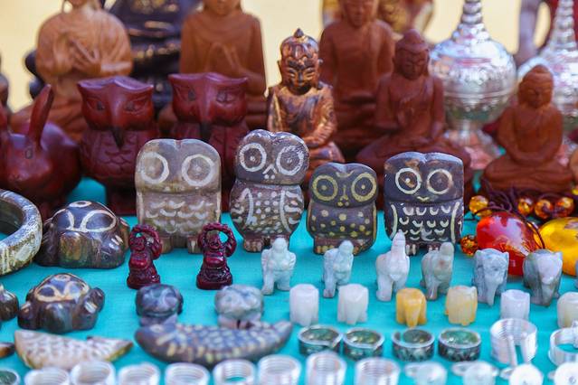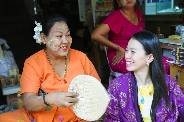 老板是个非常热情的大叔(就是那个告诉我们昂山素季是“Mama”的),很会搭讪聊天,听说我们要找树叶画特纳卡,就扔下摊子不管了,带我们去了他的小伙伴--大姐的摊子。